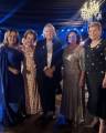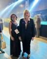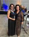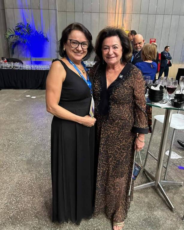 Foto com duas elegantes mulheres sorridentes: a do lado esquerdo usa óculos, tem cabelos curtos e veste vestido logo preto; a da direita tem cabelos escuros curtos e veste vestido longo estampado escuro. Elas estão posicionadas em um lugar festivo, pois observamos mesas bistrôs acompanhadas de bancos e com copos em cima. O lugar é fechado, tem luzes coloridas ao fundo e paredes claras. Pessoas estão em cena atrás delas.