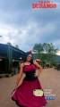 Foto de uma jovem sorridente de cabelos longos pretos, vestindo um vestido vinho longo de época com um espartilho preto na cintura e uma pena vermelha na cabeça.Ela faz pose com a mão esquerda na cintura e a mão direita segura a saia do vestido juntamente com um revólver de brinquedo. O lugar é aberto e parece um cenário de filme de velho Oeste, com chão batido, árvores ao fundo e construções de madeira que lembram uma cidade antiga. É dia e o céu está claro.