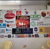 Foto de uma grande faixa presa em uma parede clara com duas cadeiras plásticas amarelas encostada nela. No centro da faixa temos em um quadro, um desenho de uma churrasqueira acesa com vários espetos e acima 1° Churrasco Fogo de Chão e abaixo o símbolo do Rotary Club de Nova Castilho. Em torno dessa representação temos muitas logomarcas com certeza dos muitos patrocinadores do evento.