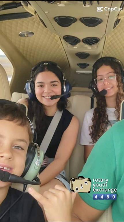 À frente na esquerda observamos parte de um garoto também com fones de ouvido e microfone posicionado na boca. Na direita temos parte de um adulto vestindo camiseta verde. Aparentemente o lugar é uma pequena aeronave com interior na cor bege. Acima na direita em branco o símbolo do CapCut. Abaixo também na direita temos uma malinha bege com rotary youth exchange em branco ao lado e abaixo quatro quadradinhos azuis com os números 4480 em branco.