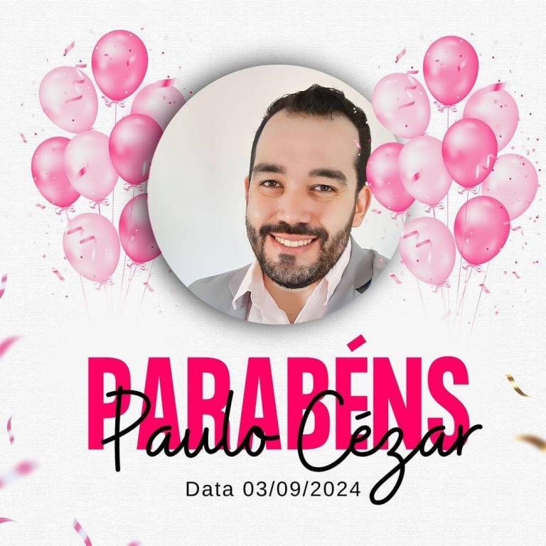 Card com fundo branco trás nas laterais esquerda e direita balões de festa em tons de rosa. Por todo os card estão espalhados serpentinas coloridas. No centro do card dois desenhos de Bento Cacke, uma meninas com três coraçõezinhos vermelhos acima da cabeça e um menino com chapeuzinho de aniversário segurando um bolo com velinha acesa. Abaixo dos bonecos temos em letras rosa e preta:
