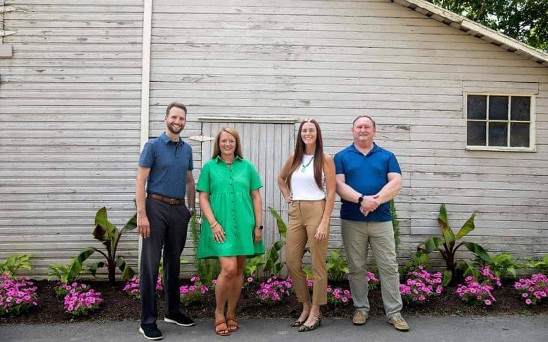 Foto com quatro pessoas: dois homens que estão nas pontas e duas jovens mulheres no centro. Todos estão vestidos de maneira esporte e estão sorrindo. É dia, o lugar é aberto e eles estão à frente de uma construção grande de madeira pintada de branco, onde observamos uma porta fechada bem atrás deles e uma janela na lateral direita. No chão acompanhando a construção e rente aos pés das pessoas existe um canteiro de arbustos verdes baixos com muitas florzinhas rosas. Na cena também é visível uma grande árvore atrás da construção na lateral direita.
