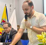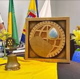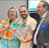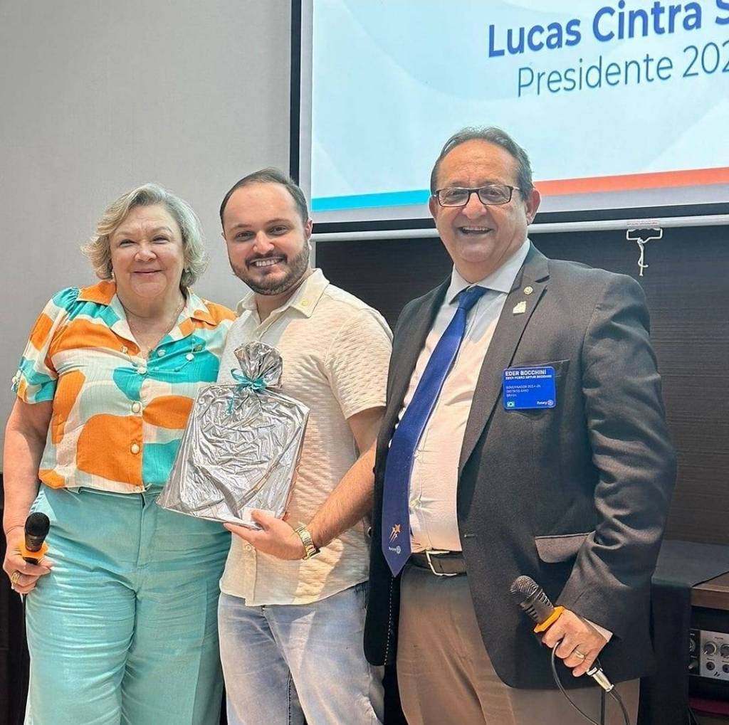 Foto do casal Gov do Distrito 4480 Éder Bocchini e Nelly ladeando um jovem rapaz sorridente, de barba, vestindo roupa clara e segurando um embrulho de presente prata nas mãos. A senhora Nelly que está na lateral esquerda, veste roupa colorida e segura um microfone preto com fio na mão direita. Já o Gov. que está na direita está posicionado de perfil, usa terno escuro, camisa clara e gravata, usa óculos e está sorridente. Atrás deles uma parede clara com um painel acima.