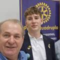 A imagem mostra duas pessoas posando para uma foto. À esquerda, há um homem mais velho com cabelo grisalho e olhos azuis, vestindo uma camisa xadrez azul. Ele está sorrindo. À direita, há um jovem com cabelo castanho claro e curto, vestindo uma camisa branca e um blazer escuro. Ele tem um olhar neutro. No fundo, há um banner do Rotary International, com o logotipo da organização e parte do texto "Prova Quádrupla" visível. O jovem tem alguns pins no blazer, incluindo um que parece ter a bandeira do Brasil. @Rotary4480