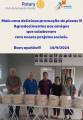 Abaixo uma foto com dois homens e três mulheres, sendo que uma delas veste camiseta azul do Rotary. Eles estão perfilados atrás de mesas brancas de ferro que trás em cima várias embalagens de pizza uma sobre a outra. No fundo paredes cinza claras com duas portas abertas, um banner rotário , um pavilhão com suas bandeiras e no alto uma galeria de fotos com fundo branco.