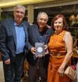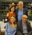 Foto com dois casais sorridentes, onde os homens vestem terno sem gravata. Um casal está sentado, apoiado por uma mesa grande de madeira com guardanapos sobrepostos sobre ela e outro casal atrás de pé abraçados e o homem de pé apoia a mão esquerda sobre o ombro do homem sentado. A mulher que está de pé segura na mão direita um livro de capa escura com gravura prata na capa. O lugar é fechado, está iluminado, tem decoração de madeira, ferro e bastante vidro. Algumas pessoas são vistas ao fundo.