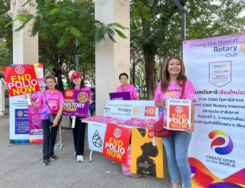 Foto de quatro pessoas com traços asiáticos vestindo camiseta rosa do Rotary. É dia e elas estão em um lugar aberto onde é possível ver dois grandes pilares claros e muitas árvores na lado de fora. Na lateral direita um grande banner branco da gestão passada Crie Esperança no Mundo todo escrito em linguagem local, está em evidência. Vários cartazes rotários, banners, panfletos e faixas estão expostos no local. Com certeza é um evento de prevenção à poliomielite, pois está em evidência vários materiais da Campanha End Pólio Now.