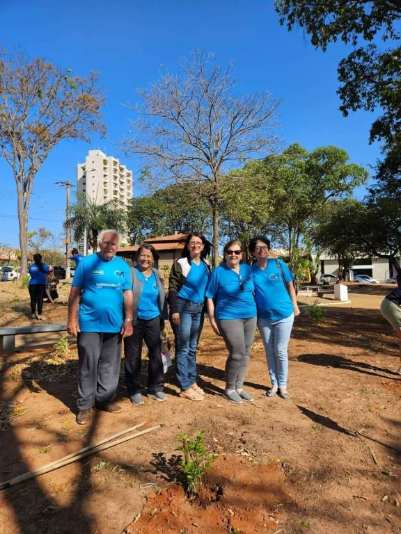 Audiodescrição: A imagem mostra um grupo de 15 pessoas posando para uma foto ao ar livre em um dia ensolarado. A maioria das pessoas está vestindo camisetas azuis, algumas com detalhes amarelos, e há uma pessoa com uma camisa branca. No centro da imagem, destacam-se algumas mudas de plantas em sacos plásticos no chão, indicando que o grupo está participando de uma atividade de plantio de árvores, com foco na preservação do meio ambiente. Este grupo é composto por rotarianos do Rotary Lins Sul, que estão engajados em ações ambientais. Ao fundo, há árvores e um prédio, e o céu está claro e azul. As pessoas estão sorrindo, transmitindo um ambiente descontraído e amigável, reforçando o espírito de colaboração e compromisso com a natureza. @Rotary4480