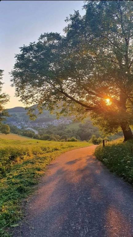 A imagem mostra uma estrada pavimentada que serpenteia através de uma paisagem rural. À direita, há uma grande árvore com folhas densas, e o sol está se pondo atrás dela, criando um efeito de luz dourada que ilumina a estrada e parte da vegetação ao redor. À esquerda, há campos verdes que se estendem até o horizonte, onde é possível ver uma pequena vila ou cidade ao longe, cercada por colinas e mais vegetação. O céu está claro, com um tom suave de azul, indicando o final do dia. A cena transmite uma sensação de tranquilidade e beleza natural.