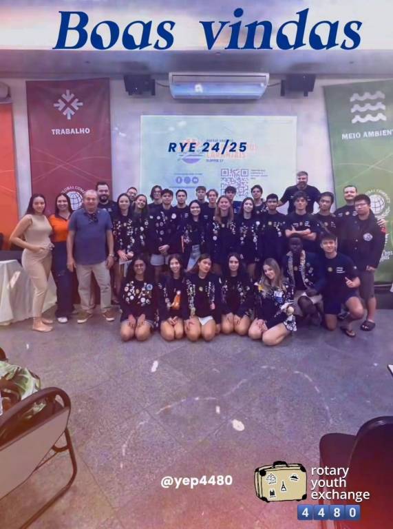 A imagem mostra um grupo de pessoas posando para uma foto em um ambiente interno. No topo da imagem, está escrito "Boas vindas" em letras grandes e azuis. No centro, há um grupo de jovens, a maioria vestindo blusas pretas com vários emblemas ou adesivos. Atrás deles, há dois banners verticais, um à esquerda com a palavra "Trabalho" e outro à direita com "Meio Ambiente". No centro, há uma projeção na parede com o texto "RYE 24/25". No canto inferior direito, há um logotipo com uma mala e as palavras "rotary youth exchange 4480". No canto inferior esquerdo, está escrito "@yep4480".