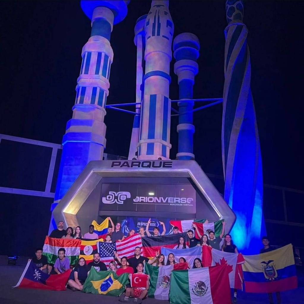A imagem mostra um grupo de pessoas posando em frente a uma estrutura futurista iluminada com luzes azuis e roxas. A estrutura tem três torres altas e um letreiro que diz "PARQUE ORIONVERSE Realidade Virtual". As pessoas estão segurando bandeiras de vários países, incluindo Brasil, Estados Unidos, México, Turquia, Índia, Taiwan, Colômbia, Equador, entre outras. A cena parece ser à noite, e o ambiente tem uma atmosfera de parque temático ou evento internacional.