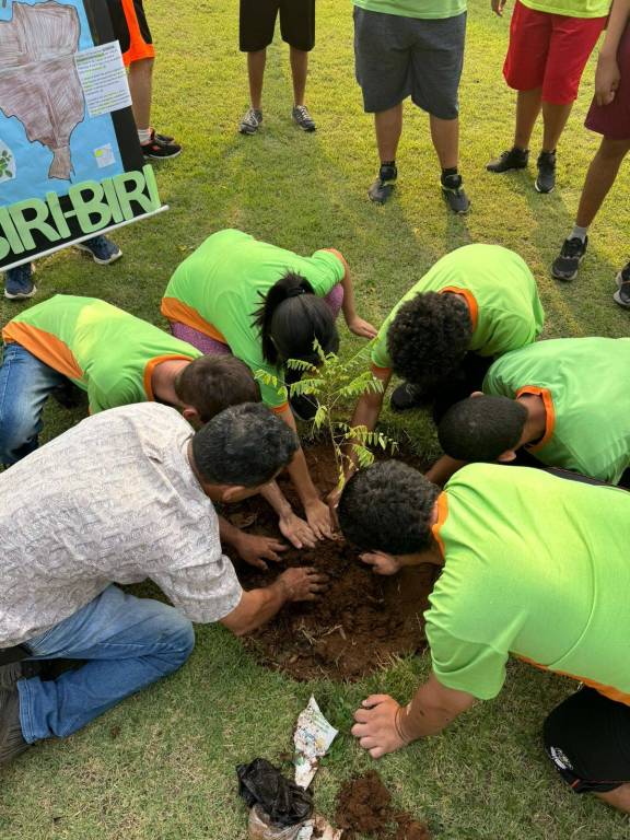 A imagem mostra um grupo de pessoas posando para uma foto em um gramado. Ao centro, há um cartaz com um mapa do Brasil e a palavra "BIRIBIRI" escrita na parte inferior. As pessoas estão vestindo camisetas verdes, exceto por duas pessoas que estão usando camisetas azuis. Algumas pessoas estão agachadas na frente, enquanto outras estão em pé atrás. No chão, à frente do grupo, há uma pequena árvore plantada. Ao fundo, é possível ver um prédio residencial e algumas palmeiras. A atmosfera parece ser de um evento ou atividade ao ar livre, possivelmente relacionado a plantio ou meio ambiente.