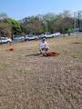 É dia, o lugar é aberto parecendo um campo com árvores ao fundo e uma construção ao longe.