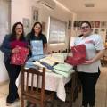 Foto com três mulheres sorridentes em um lugar fechado, iluminado e com vários objetos rotários nas paredes claras ao fundo. Elas estão posicionadas em volta de uma mesa de madeira com toalha clara e vários jogos coloridos de toalha de banho bordados e embalados em plástico transparente. Cada uma delas seguram jogos nas mãos para expor o trabalho.
