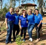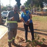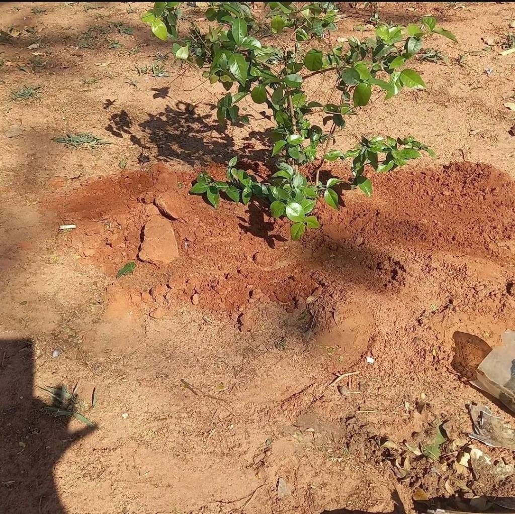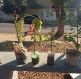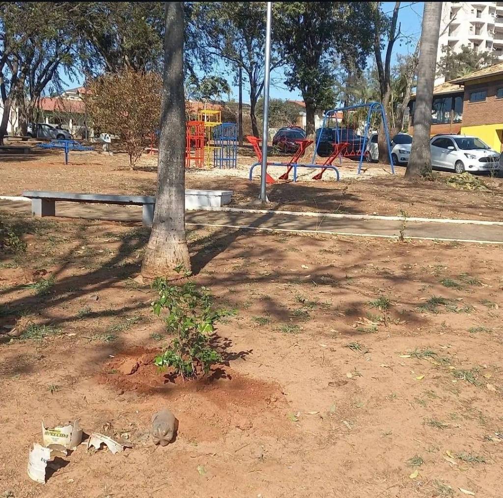 Foto em um dia ensolarado de um banco de cimento provavelmente em uma praça, com quatro mudas de árvore para serem plantadas em cima. Ao fundo parte de uma árvore adulta com calçamento em volta, calçada, via e construções depois da rua. Um carro está estacionado do outro lado da rua.