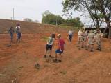 Foto em campo aberto em um dia claro de dois homens e uma mulher ao centro. O homem da esquerda está agachado, veste camiseta preta do Rotary e boné preto; a mulher que está no centro veste camiseta azul do Rotary e está curvada para a frente e o homem da direita também está agachado e usa camiseta branca.