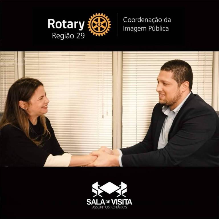 A imagem apresenta duas pessoas sentadas frente a frente, sorrindo e apertando as mãos de maneira amigável. À esquerda, está uma mulher com cabelos castanhos e longos, vestindo uma blusa preta com detalhes claros nas mangas. À direita, está um homem com cabelo curto e barba, usando um terno escuro e uma camisa azul clara. Eles estão em um ambiente de escritório, com persianas fechadas ao fundo. Na parte superior da imagem, há um fundo preto com o logotipo do Rotary, que inclui uma roda dentada amarela, e o texto “Rotary Região 29 Coordenação da Imagem Pública”. Na parte inferior, também sobre um fundo preto, há um logotipo com duas figuras estilizadas sentadas em uma mesa, acompanhado do texto “SALA DE VISITA ASSUNTOS ROTÁRIOS”.