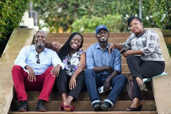 A imagem mostra quatro pessoas sentadas em uma escada ao ar livre, todas sorrindo e parecendo muito felizes. Da esquerda para a direita, temos: