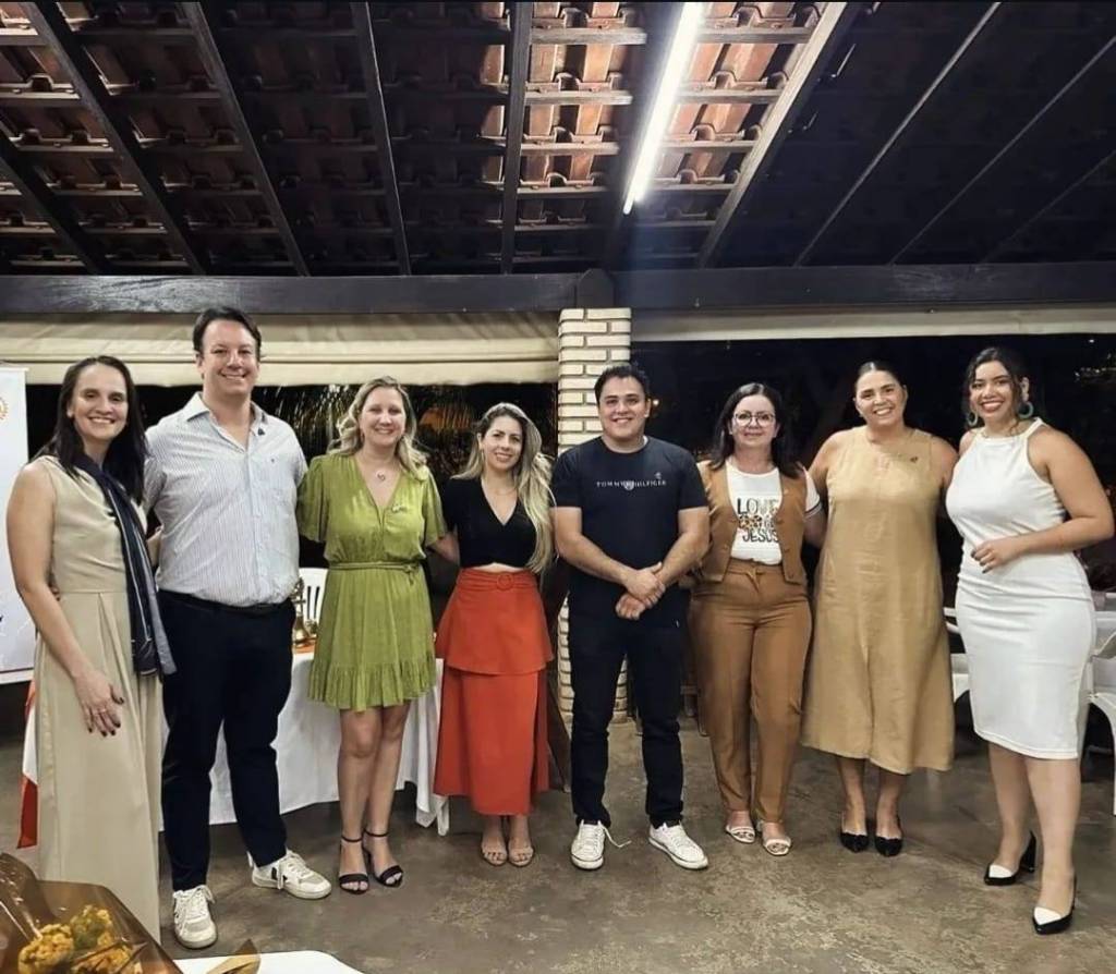 A imagem mostra um grupo de oito pessoas posando para uma foto em um ambiente coberto, em um salão de eventos. Da esquerda para a direita, há quatro mulheres e quatro homens. As pessoas estão vestidas de maneira casual e elegante, indicando que estão participando de uma posse de novos companheiros no Rotary São José do Rio Preto Eco. A primeira mulher à esquerda está usando um vestido bege claro, o homem ao lado dela está de camisa listrada e calça escura, a mulher ao lado dele está com um vestido verde claro, e a próxima mulher está com uma blusa preta e saia vermelha. O homem no centro está usando uma camiseta preta e calça escura. A mulher ao lado dele está com uma camiseta branca com estampa e calça marrom, a próxima mulher está com um vestido bege, e a última mulher à direita está usando um vestido branco. Todos estão sorrindo, transmitindo uma sensação de acolhimento e pertencimento. O teto é de madeira e há uma luz fluorescente acima do grupo.