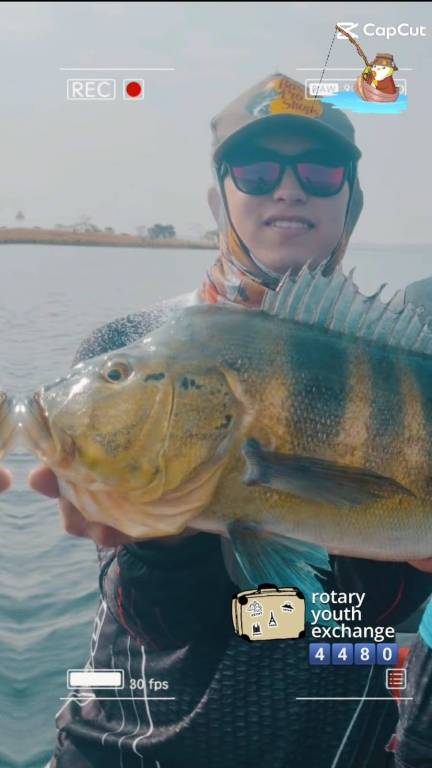 A imagem mostra uma pessoa segurando um peixe grande, provavelmente um tucunaré, em um ambiente aquático. A pessoa está usando óculos escuros, um boné com o logotipo "Bass Pro Shops" e um protetor de pescoço. No canto superior direito, há um adesivo de um urso pescando e o logotipo do aplicativo "CapCut". No canto superior esquerdo, há um ícone de gravação com a palavra "REC" e um ponto vermelho. Na parte inferior, há um contador de "30 fps" e um gráfico de bateria. No canto inferior direito, há um gráfico de "rotary youth exchange" com o número "4480" e uma ilustração de uma mala com adesivos de viagem. Ao fundo, é possível ver a água e uma linha de árvores na margem.