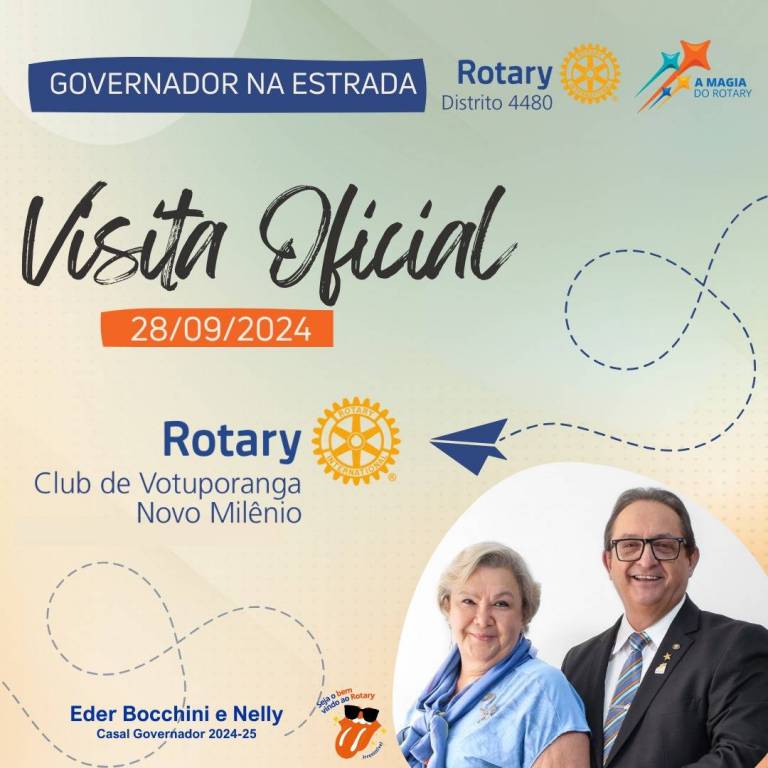 No card com fundo verde claro, observamos no canto superior esquerdo uma tarja com fundo azul escuro escrito em branco: Gov. Na Estrada. Do lado direito superior temos o símbolo colorido do Rotary Distrito 4480 e a logo colorida da gestão atual A Magia do Rotary. Abaixo escrita em letra maior preta: Visita Oficial. Do lado direito dentro de uma pequena tarja com fundo laranja temos escrito em branco: 28/09/2024. Abaixo temos o símbolo do Rotary Club de Votuporanga Novo Milênio No canto inferior esquerdo temos em azul: Eder Bocchini e Nelly - Casal Gov. 2024-25 e a logo Seja Bem Vindo ao Rotary, caracterizado pelo óculos preto e a língua na cor laranja, escrito abaixo Irresistível.