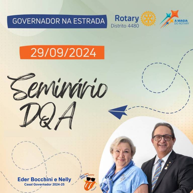 No card com fundo verde claro, observamos no canto superior esquerdo uma tarja com fundo azul escuro escrito em branco: Gov. Na Estrada. Do lado direito superior temos o símbolo colorido do Rotary Distrito 4480 e a logo colorida da gestão atual A Magia do Rotary. Do lado direito dentro de uma pequena tarja com fundo laranja temos escrito em branco: 29/09/2024. Abaixo temos em letras pretas de mão: Seminário de DQA. No canto inferior esquerdo temos em azul: Eder Bocchini e Nelly - Casal Gov. 2024-25 e a logo Seja Bem Vindo ao Rotary, caracterizado pelo óculos preto e a língua na cor laranja, escrito abaixo Irresistível.