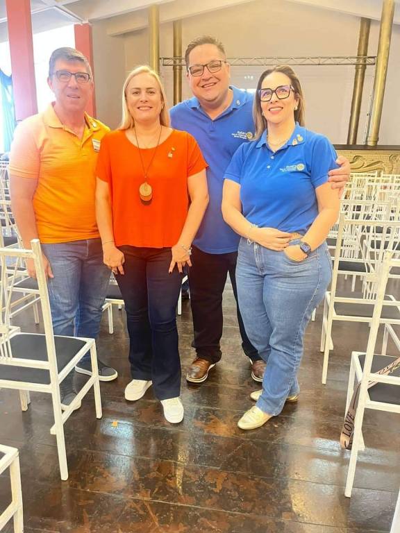 A imagem mostra um grupo de rotarianos do clube Novas Gerações de Votuporanga participando do seminário "Desenvolvimento do Quadro Social" do Distrito 4480. Eles estão em um ambiente interno, possivelmente uma sala de conferências ou salão, com uma tela de projeção ao fundo exibindo o logotipo do Rotary. Da esquerda para a direita, há um homem de óculos com uma camisa polo laranja, uma mulher loira com uma blusa laranja, um homem de óculos com uma camisa polo azul e uma mulher de óculos com uma camisa polo azul. Todos estão sorrindo para a câmera, demonstrando entusiasmo e engajamento no evento.
