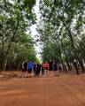 A imagem captura um grupo de sete rotaractianos de Tanabi em uma caminhada, transmitindo um forte clima de companheirismo. Eles estão em uma estrada de terra cercada por árvores altas e verdes, que formam um túnel natural de folhagem. O grupo está vestido com roupas esportivas, sugerindo que estão participando de uma atividade ao ar livre. O céu é parcialmente visível através das copas das árvores, e a estrada tem uma coloração avermelhada. A atmosfera é de amizade e união entre os participantes.