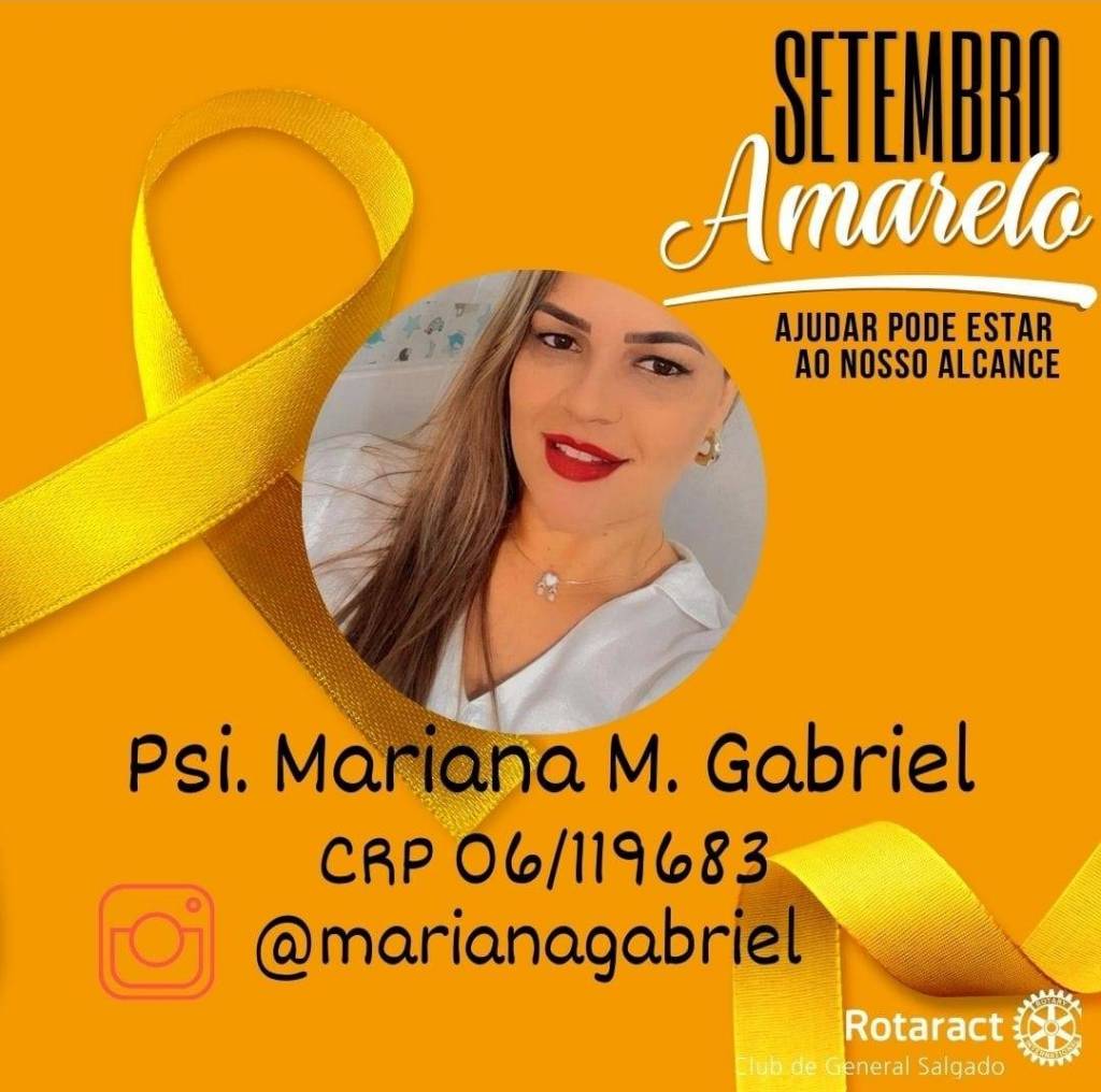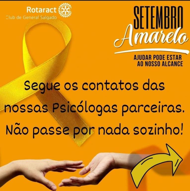 A imagem é um cartaz de conscientização sobre o "Setembro Amarelo", que é uma campanha de prevenção ao suicídio e conscientização sobre transtornos mentais. O fundo é amarelo, e há uma fita amarela, que é o símbolo da campanha, destacada na imagem. No centro, há duas mãos se estendendo uma em direção à outra, simbolizando ajuda e apoio. O texto no cartaz diz: "Setembro Amarelo. Mês de conscientização sobre transtornos mentais e prevenção ao suicídio. Ajudar pode estar ao nosso alcance." Na parte inferior, está o logotipo do Rotaract Club de General Salgado.