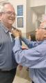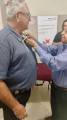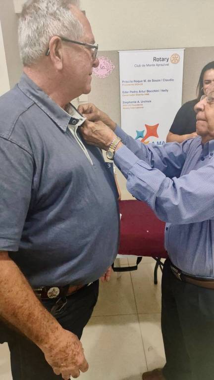 A imagem captura um momento especial de posse de um novo associado no Rotary Club de Monte Aprazível. Dois rotarianos estão em destaque. O rotariano à esquerda, que está sorrindo, está recebendo um broche ou crachá, simbolizando sua entrada oficial no clube. O rotariano à direita está cuidadosamente prendendo o broche na camisa do novo associado. Ambos estão vestidos de forma elegante, com o rotariano à direita usando um relógio de pulso dourado. Ao fundo, a presença de uma mulher sentada e as placas na parede, incluindo a "Prova Quádrupla" do Rotary, reforçam o ambiente de cerimônia e compromisso com os valores do clube. Este momento representa a acolhida e integração de um novo membro à comunidade rotariana.
