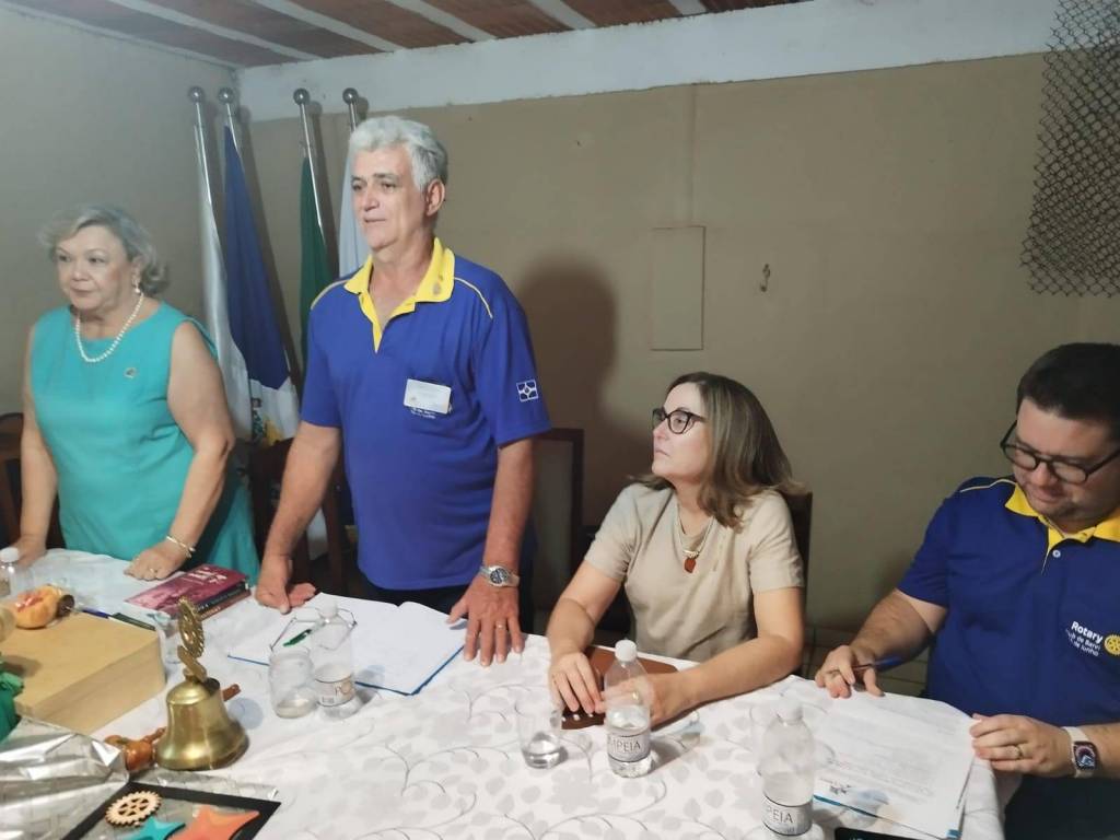 A imagem mostra um evento importante do ano no Rotary Club de Bariri, destacando a presença do casal governador. No centro da foto, está o governador, vestindo uma camisa social e gravata, acompanhado de sua esposa, que está vestida de forma elegante. Eles estão cercados por membros do clube, alguns dos quais vestem camisas do Rotary Club. Todos estão sorrindo, criando um clima de camaradagem e celebração. À frente do grupo, há uma mesa coberta com uma toalha branca, onde estão dispostos itens cerimoniais típicos do Rotary, como um sino e um martelo de madeira, além de garrafas de água e um caderno. A presença do casal governador e a disposição dos objetos na mesa reforçam a solenidade e a importância do evento para o clube.
