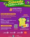 A imagem é um cartaz promocional com o tema "Goleada Contra a Pólio". No topo, há um título em letras grandes e verdes. Abaixo, em um fundo roxo, está escrito "#Juntos Contra a Pólio".