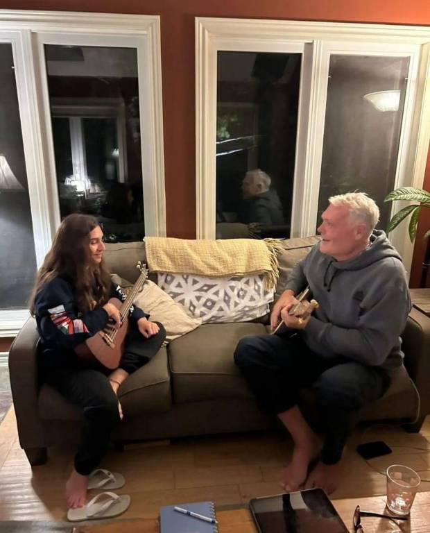 O pai estrangeiro ensinou a Maria Leonor a tocar Ukulele.