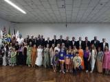 A imagem mostra um grupo grande de pessoas reunidas em um salão durante a visita oficial do governador do distrito 4480 ao Rotary de Itápolis, que é o evento principal do ano do clube. Na fileira de trás, há homens em trajes formais, provavelmente incluindo o governador e outros membros do Rotary. Na frente, há uma mistura de homens, mulheres e crianças, vestindo roupas casuais e coloridas. Ao fundo, estão várias bandeiras, incluindo a do Brasil e de São Paulo, reforçando o caráter oficial do evento. O ambiente é de celebração e formalidade.