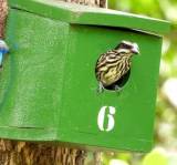 A imagem apresenta uma caixa de ninho de madeira pintada de verde, fixada em um tronco de árvore. A caixa tem um design simples, com uma tampa que parece ser removível na parte superior. Na frente da caixa, há um buraco circular que serve como entrada para os pássaros. Um pássaro está parcialmente saindo desse buraco. Ele tem um padrão de listras pretas e amarelas em suas penas, o que pode indicar que é um tipo de ave da família dos papa-moscas ou similar. A caixa de ninho tem o número "6" pintado em branco logo abaixo do buraco de entrada. Ao fundo, a imagem está desfocada, mas é possível perceber que há uma vegetação verde, sugerindo que a cena ocorre em um ambiente natural, possivelmente em uma floresta ou parque. A luz do dia ilumina a cena, destacando as cores vivas da caixa e do pássaro.