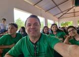 Selfie feita por um homem sorridente vestindo camiseta verde. Atrás deles vários jovens, meninos e meninas também vestindo verde. Todos estão sentados. O lugar é coberto com grandes aberturas nas laterais.