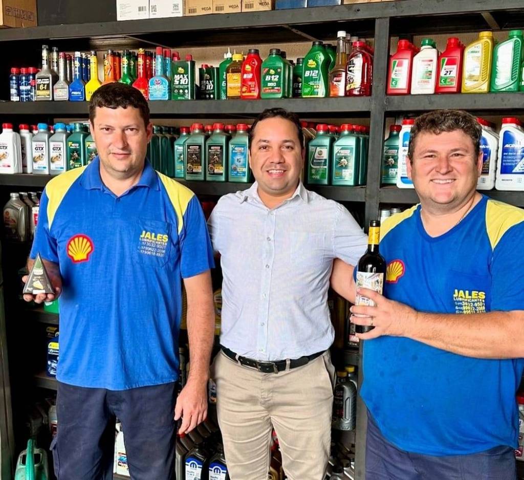 Na imagem, há três homens em pé, lado a lado, em frente a prateleiras cheias de produtos automotivos, como óleos e lubrificantes de diversas marcas e cores.