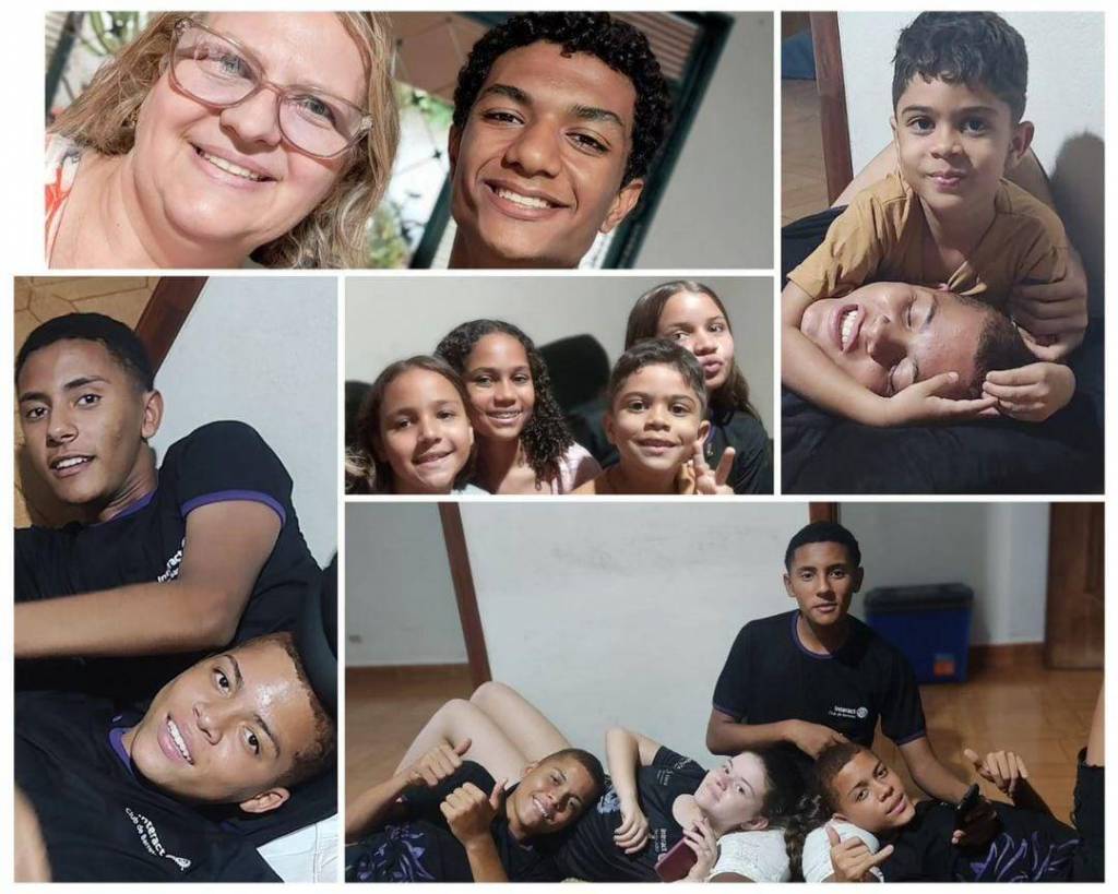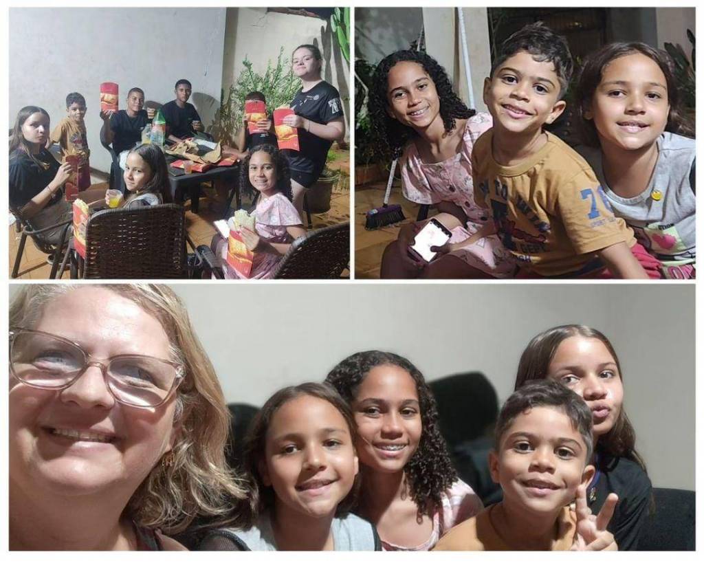 Na terceira foto, uma mulher mais velha, usando óculos, está tirando uma selfie com quatro crianças. Todos estão sorrindo. A mulher está à esquerda da imagem, e as crianças estão agrupadas à direita, com uma delas fazendo um sinal de paz com os dedos. A cena reflete um momento alegre e familiar, típico das ações comunitárias dos Rotarianos no Dia das Crianças.