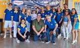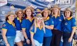 A imagem mostra um grupo de 16 pessoas posando para uma foto em frente a um banner. A maioria das pessoas está vestindo camisetas azuis com detalhes amarelos e logotipos no peito, que são uniformes do evento. Algumas pessoas estão usando chapéus de palha. No centro, há um homem de camisa verde e chapéu azul, e ao lado dele, um homem de óculos e camiseta azul. O banner ao fundo tem vários logotipos, incluindo "Maturatta Friboi", "Fábrica 1" e símbolos do Rotary Club, indicando que o evento é promovido pelo Rotary Club Lins Sul. As pessoas estão sorrindo e participam de um evento beneficente chamado "Costelaço".