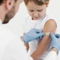 Na imagem, uma criança de pele clara e cabelo loiro curto está sentada, vestindo uma camiseta branca. Ela está olhando para o braço esquerdo, onde um profissional de saúde está aplicando um curativo adesivo. O profissional, que aparece parcialmente na imagem, usa um jaleco branco e luvas azuis, e está cuidadosamente colocando o curativo sobre o local da injeção. A cena sugere que a criança acabou de receber uma vacina. O fundo é claro e desfocado, trazendo o foco para a interação entre a criança e o profissional de saúde. Esta imagem faz parte de uma campanha de vacinação contra a pólio, patrocinada pelo Rotary Internacional, destacando a importância da imunização infantil.