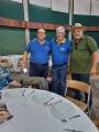 A imagem mostra três homens em pé, sorrindo para a câmera, em um ambiente que parece ser um salão de eventos. O homem à esquerda está usando uma camisa polo azul com o logotipo do Rotary Club. O homem no centro também veste uma camisa polo azul, mas com detalhes amarelos e o logotipo do "Costelaco Rotary Club". O homem à direita está usando uma camisa polo verde e um chapéu de palha. Eles estão em frente a uma mesa redonda coberta com uma toalha branca, onde há pratos, talheres e guardanapos dispostos. Há também um pacote de biscoitos na mesa. Ao fundo, há cadeiras dobráveis e mesas cobertas com toalhas brancas. As paredes são verdes com detalhes em madeira.