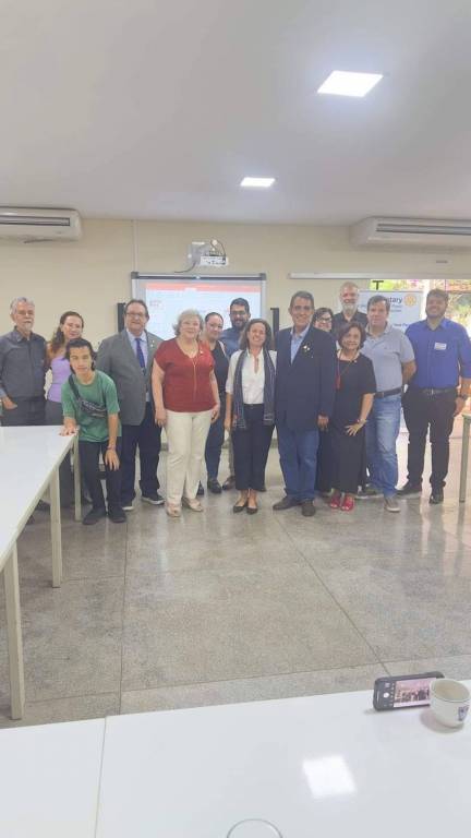 A imagem mostra um grupo de pessoas reunidas em uma sala. A sala parece ser de reunião ou conferência, pois há uma tela de projetor ao fundo exibindo uma apresentação. Existem mesas e cadeiras arranjadas ao redor da sala, e um smartphone está colocado em uma das mesas, aparentemente gravando ou tirando uma foto do grupo. Há também um copo na mesa ao lado do smartphone. As pessoas na imagem estão vestidas com uma mistura de roupas casuais e formais, sugerindo um evento profissional ou semi-formal. O fundo inclui unidades de ar-condicionado e um banner com o logotipo do Rotary International, indicando que pode ser uma reunião ou evento do Rotary Club.