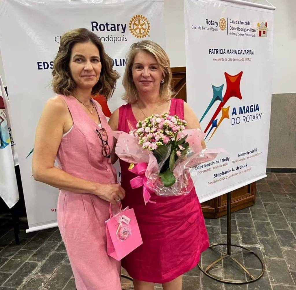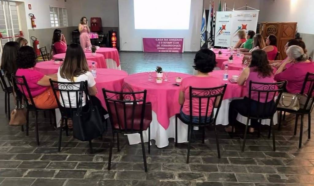 Ao fundo, há dois banners do Rotary Club. O banner à esquerda exibe o logotipo do Rotary com as palavras "Club de Fernandópolis". O banner à direita destaca o título "A Magia do Rotary" e menciona Patricia Maria Cavariani como presidente da Casa da Amizade para o período de 2024-25. Também são mencionados outros nomes, como Eder Bocchini, Nelly Bocchini e Stephanie A. Urchick, associados ao evento. A presença desses elementos sugere que o evento pode estar relacionado a uma palestra ou atividade do Outubro Rosa promovida pelo Rotary Club de Fernandópolis.