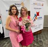 A imagem mostra duas mulheres em um evento do Rotary Club, possivelmente relacionado à campanha Outubro Rosa, que visa conscientizar sobre o câncer de mama. Ambas estão vestidas em tons de rosa, simbolizando a campanha. A mulher à esquerda tem cabelos castanhos e ondulados, usa um vestido rosa claro sem mangas e segura um pequeno saco de presente rosa. Ela também tem óculos pendurados na frente do vestido. A mulher à direita tem cabelos loiros e veste um vestido rosa mais escuro. Ela segura um buquê de flores pequenas, embrulhado em papel rosa com um laço.