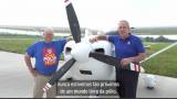 Na imagem, os dois homens estão em um ambiente ao ar livre, ao lado de um avião monomotor, que é caracterizado por sua hélice na frente. O homem à esquerda, de cabelos grisalhos e óculos, veste uma camiseta azul com a frase "END POLIO NOW" em letras grandes e coloridas, destacando-se no centro da camiseta. O homem à direita, também de cabelos grisalhos, veste uma camisa polo azul com o logotipo do Rotary no peito. Ambos parecem estar em um ambiente descontraído, possivelmente participando de uma campanha ou evento relacionado à erradicação da poliomielite.