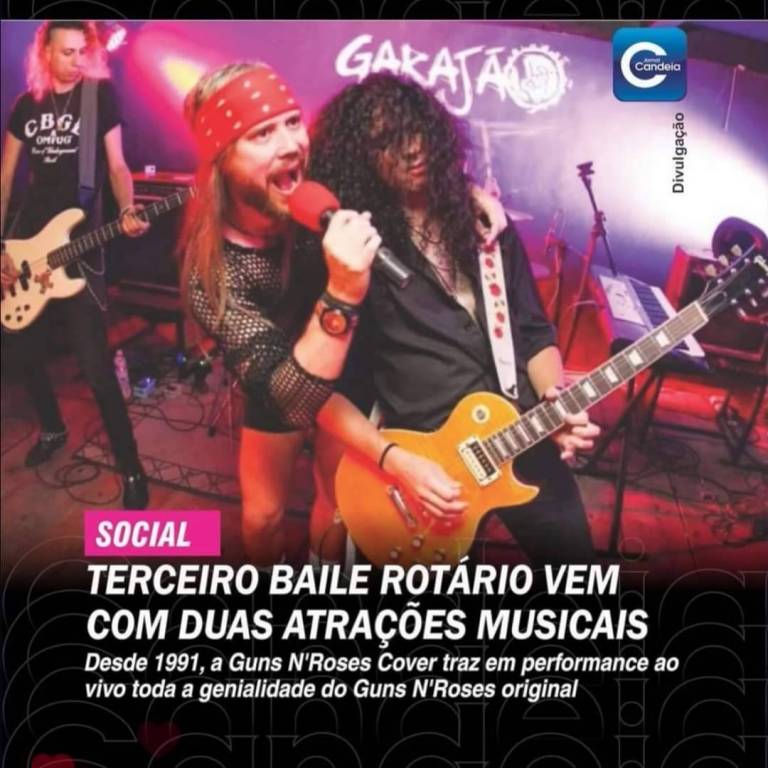 A imagem promove o "Terceiro Baile Rotário", um evento organizado pelo Rotary Bariri. O objetivo do baile é arrecadar fundos para desenvolver projetos na comunidade. A imagem destaca uma das atrações musicais, uma banda cover do Guns N' Roses, que promete trazer toda a energia e genialidade do grupo original em suas performances ao vivo. O evento oferece à comunidade a chance de se divertir enquanto apoia iniciativas locais importantes.