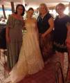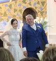 Foto de um casal super sorridente: ela veste vestido branco de noiva, com cabelos presos e véu; ele terno azul com flores na lapela com camisa e gravata branca por baixo; tem cabelos e cavanhaque grisalho. À frente observamos pessoas sentadas olhando para o casal; atrás um cenário colorido com flores e velas brancas. Aparentemente estão deixando um espaço religioso.