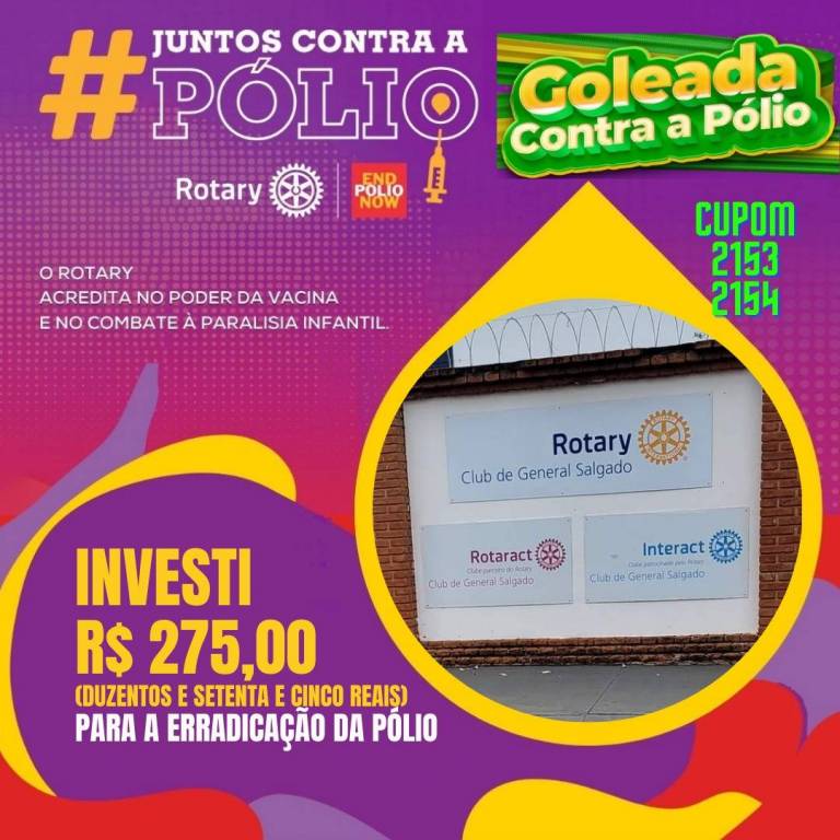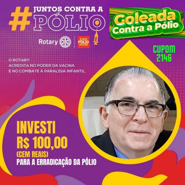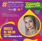 Na parte inferior esquerda, em letras grandes e amarelas, está escrito "INVESTI R$ 100,00 (CEM REAIS) PARA A ERRADICAÇÃO DA PÓLIO". Ao lado direito da foto, está o texto "CUPOM 2278" em verde.