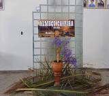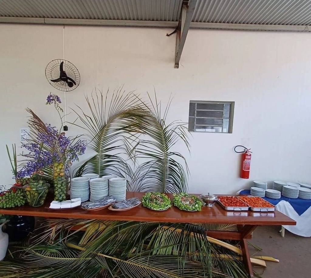 A imagem apresenta uma decoração para um evento denominado "Almoço Caipira" referente ao período 2024/2025, promovido pelo Rotary Club de Auriflama. O cartaz está afixado em uma estrutura composta por blocos de vidro quadrados. Em primeiro plano, um vaso de cerâmica marrom exibe flores de cor roxa, posicionado sobre um suporte de madeira. No chão, ao redor do vaso, encontram-se folhas de palmeira dispostas de maneira decorativa. No canto superior direito, há várias fotografias emolduradas fixadas na parede.