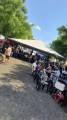 A imagem mostra um grupo de 13 pessoas posando para uma foto ao ar livre, em um ambiente que parece ser um encontro de motociclistas. A maioria das pessoas está usando coletes de couro com patches, típicos de motociclistas. Algumas pessoas estão usando camisetas roxas com a inscrição "Aíla Salute". Há duas mulheres agachadas na frente, uma delas com uma bandeira do Brasil no braço. Ao fundo, há árvores e um veículo grande, semelhante a um motorhome. Todos parecem estar sorrindo e em um clima descontraído.